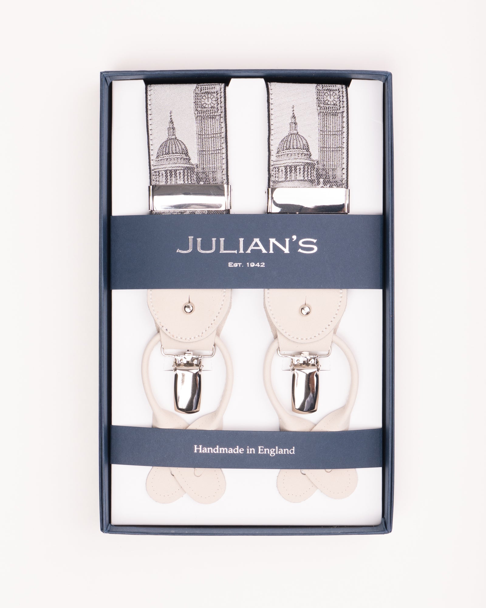 Manufactured since 1820, Albert Thurston braces are the benchmark of superior quality in gentlemen's suiting accessories. Having been popularised by Daniel Craig, in the James Bond films, braces have seen a big comeback. This particular style is suitable for all occasions where a little pop of individuality or sheer function require the absolute best.