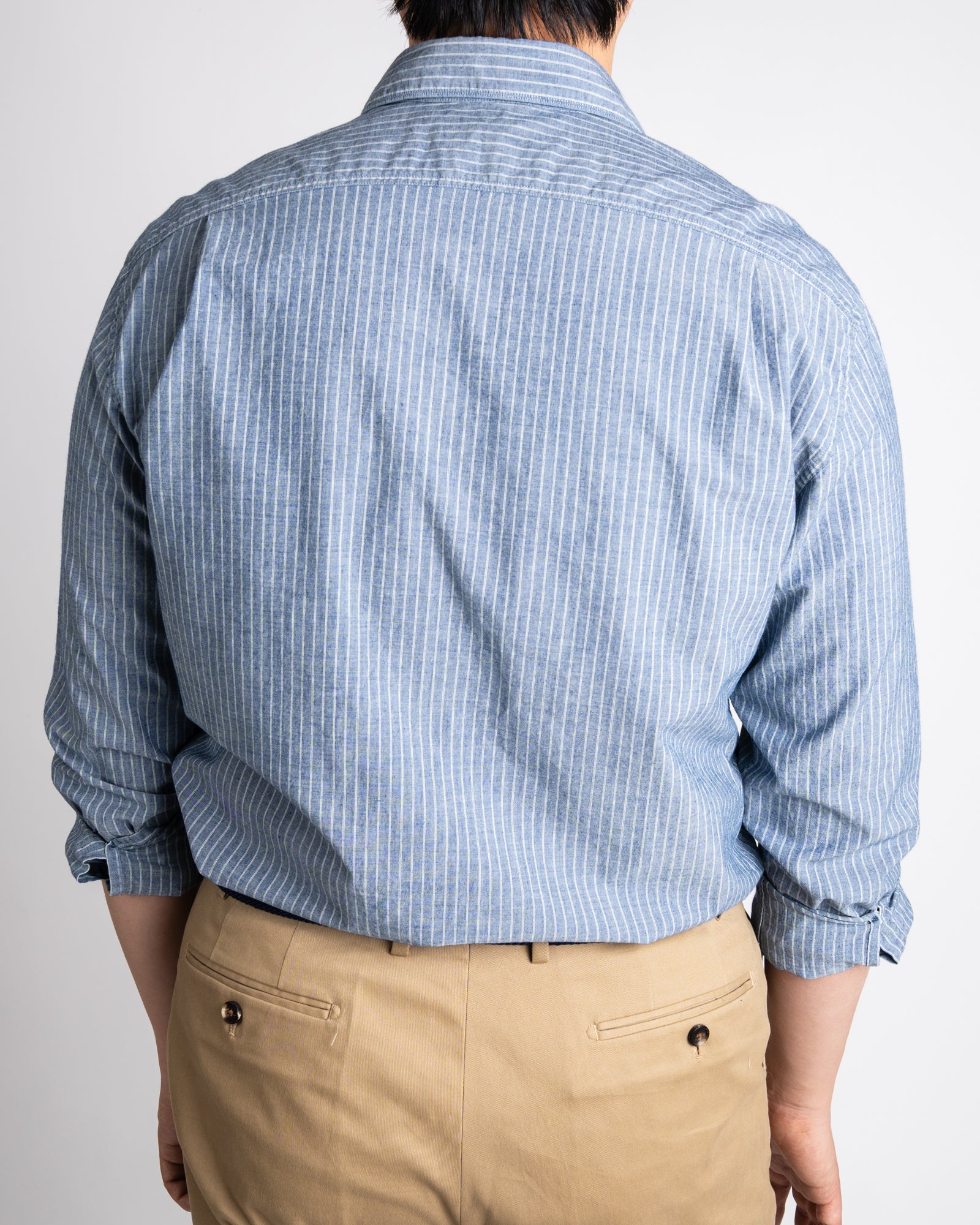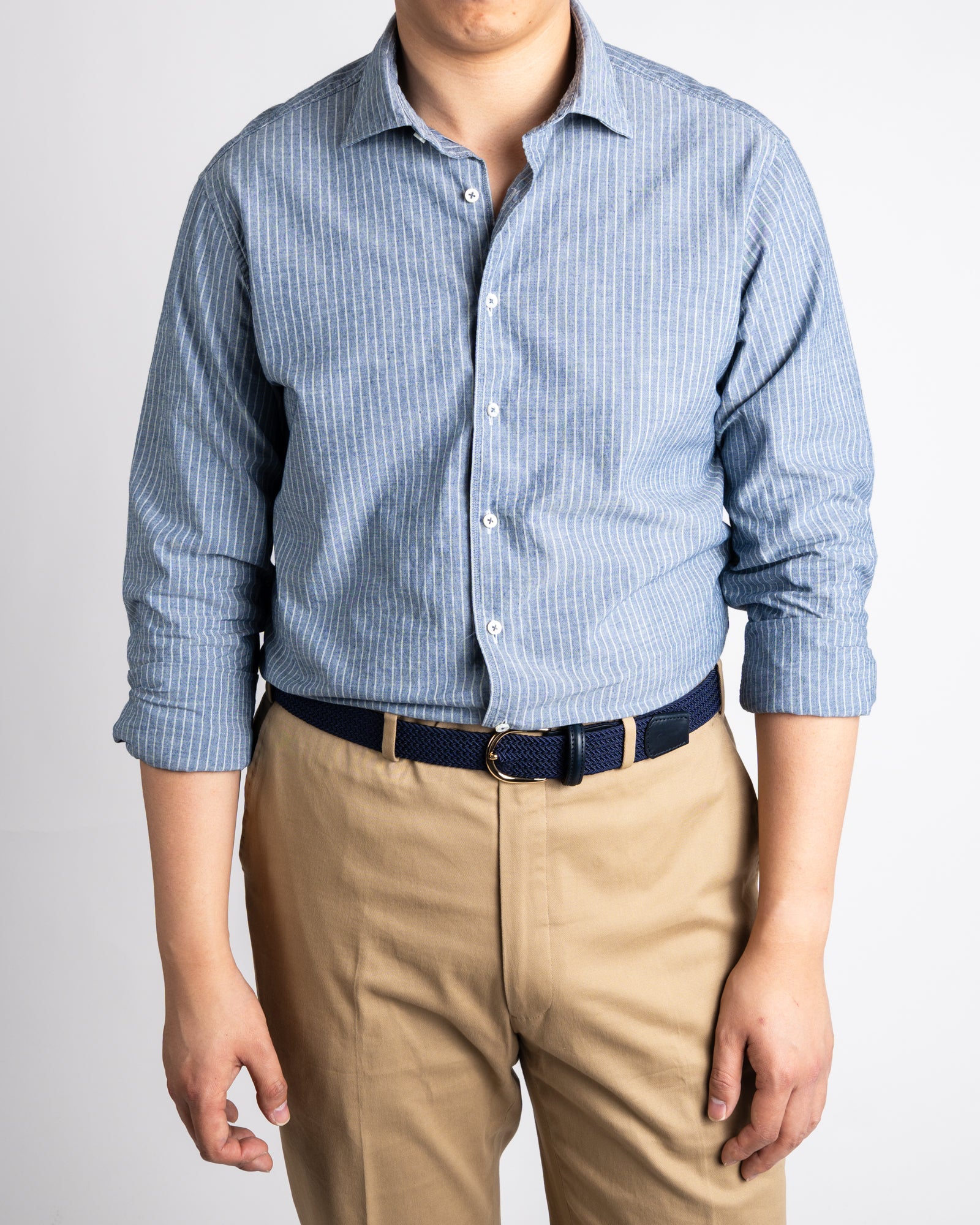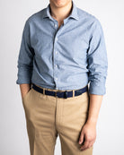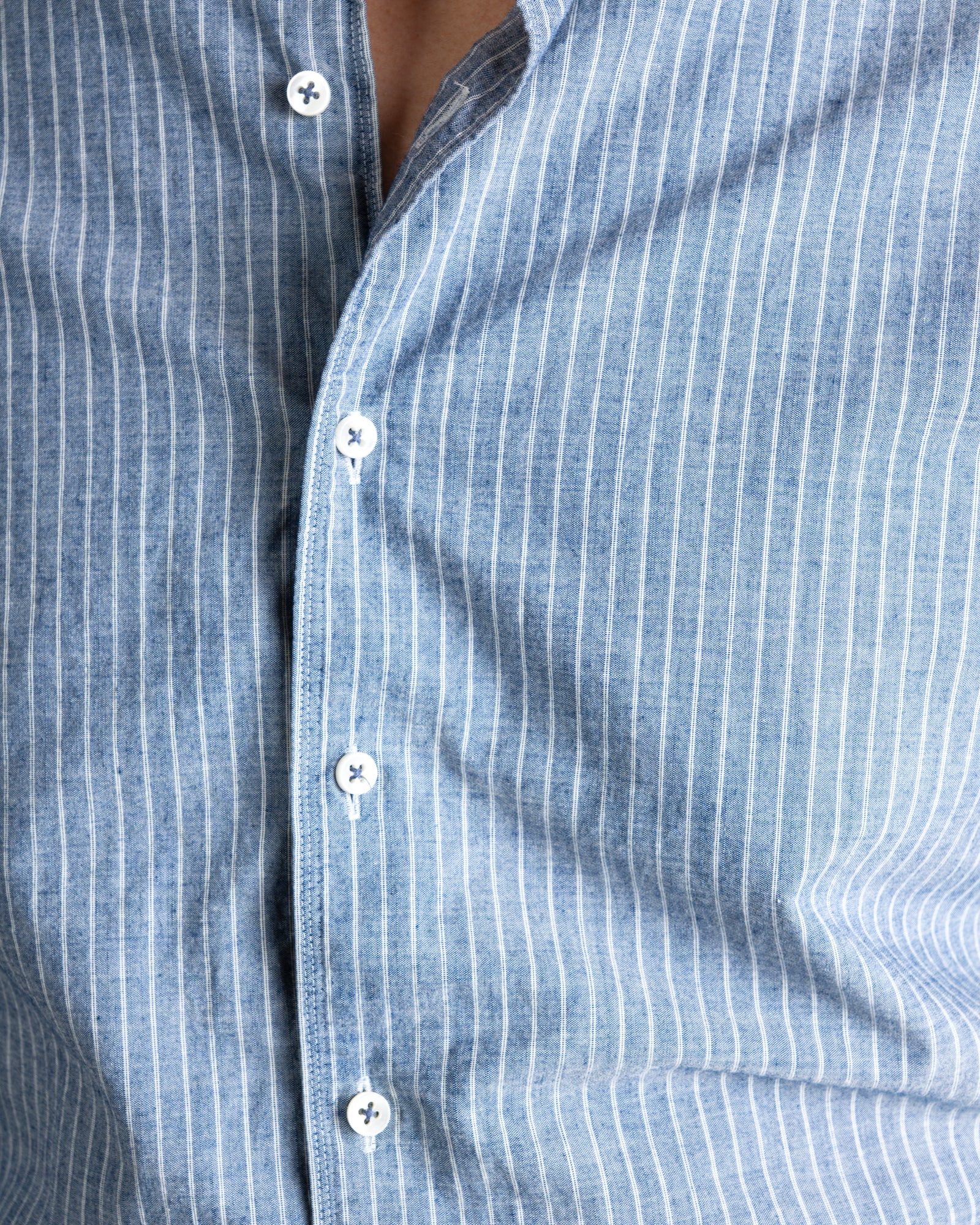 The shirt is detailed with mother of pearl buttons, single cuffs and a cut away collar.