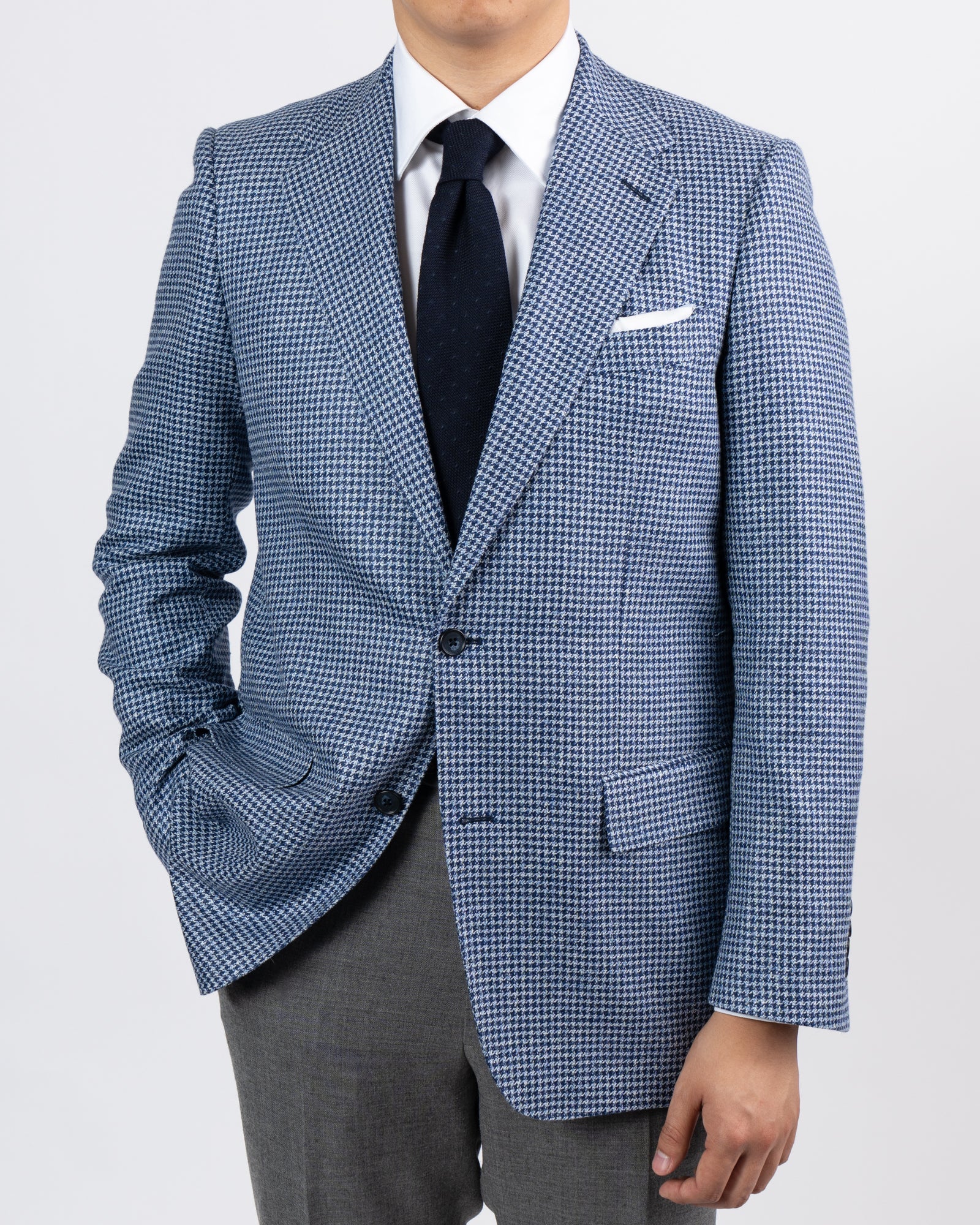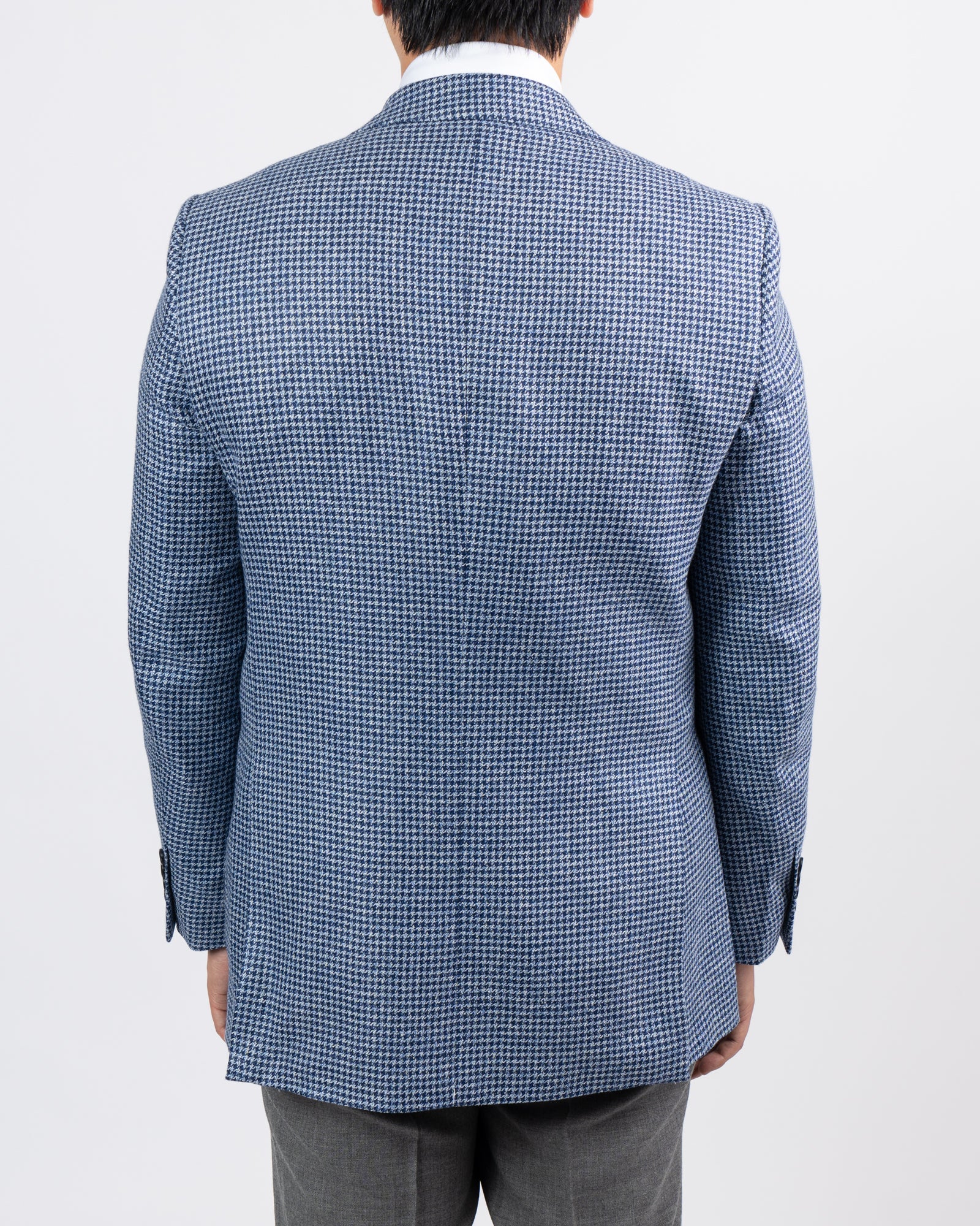 Based out of Huddersfield, Marling & Evans is one of England’s oldest mills, with an expertise in fabric weaving that dates back to 1782. This particular eye-catching jacket features a classic houndstooth pattern. Sleeves are finished with buttons sewn on to be ready to wear right out of the gate, or can be converted to surgeon’s cuffs if desired.