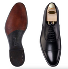 Lonsdale, a classically designed straight cap oxford made from the finest black calf leather with bark tanned single leather soles. From the Hand Grade collection.