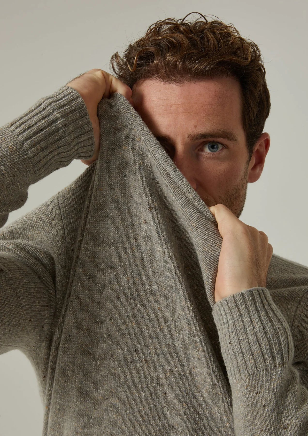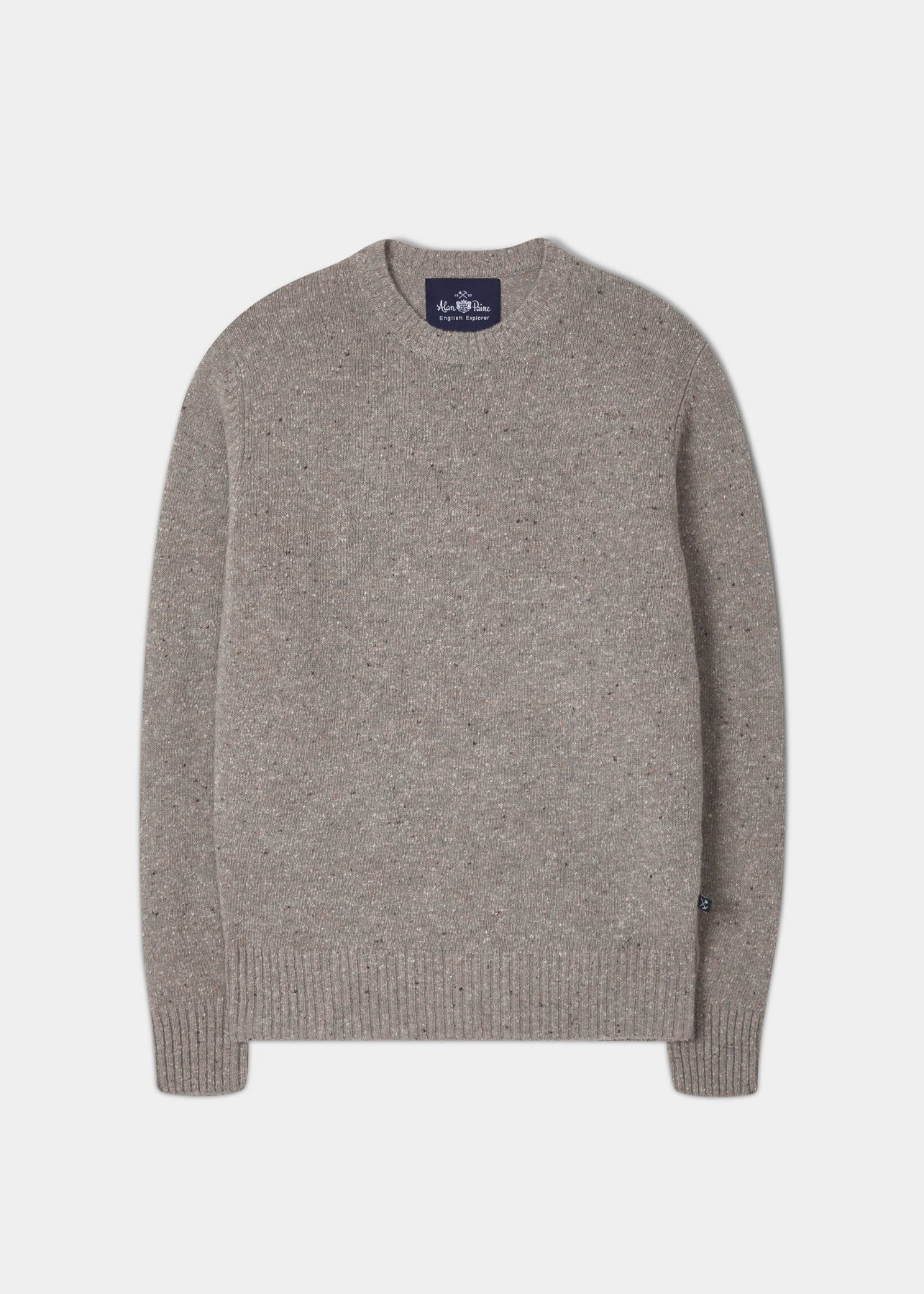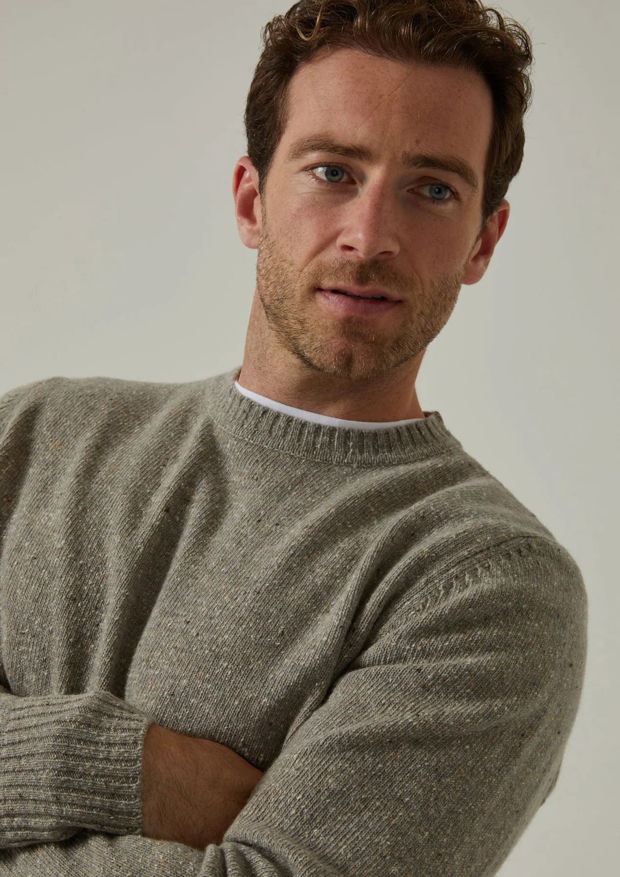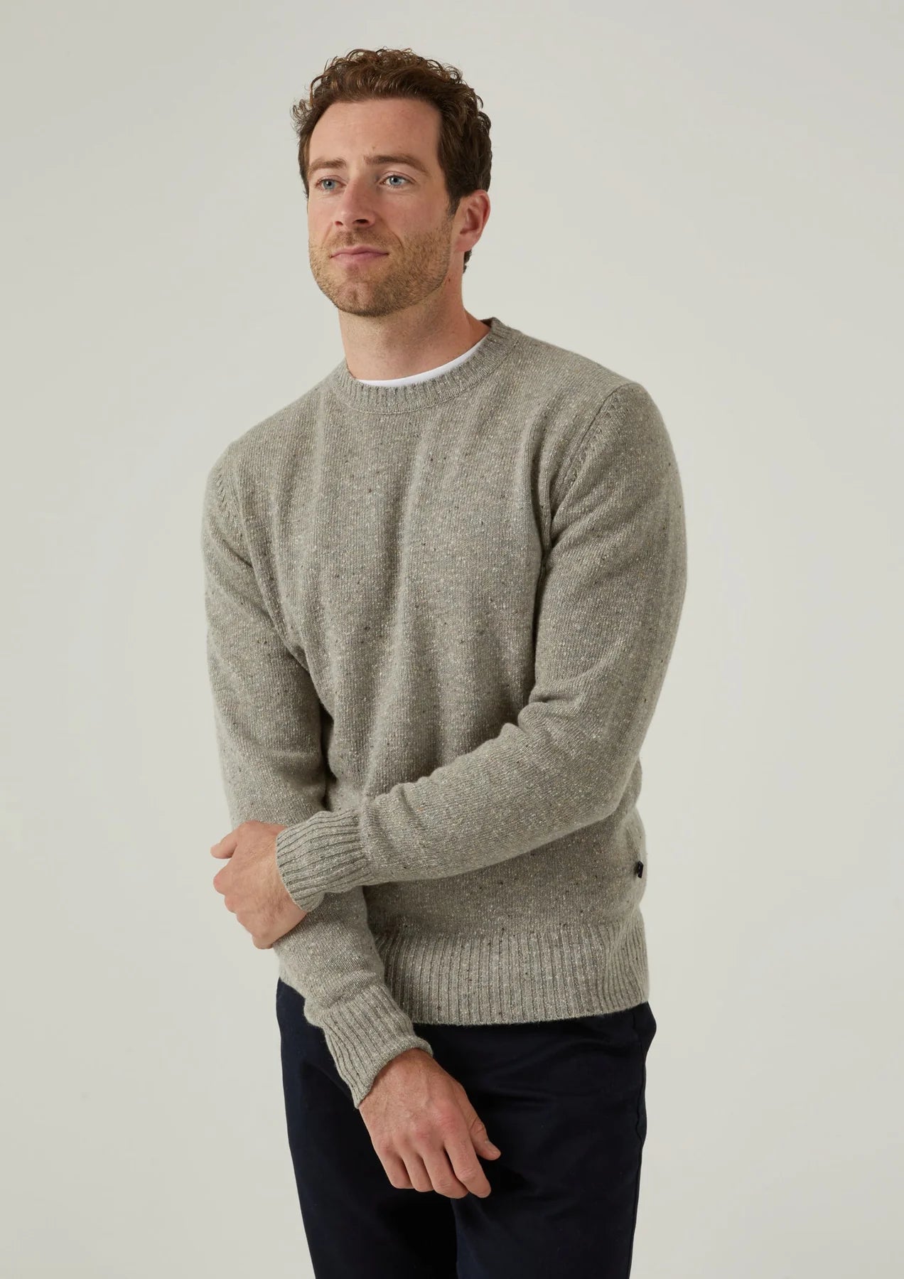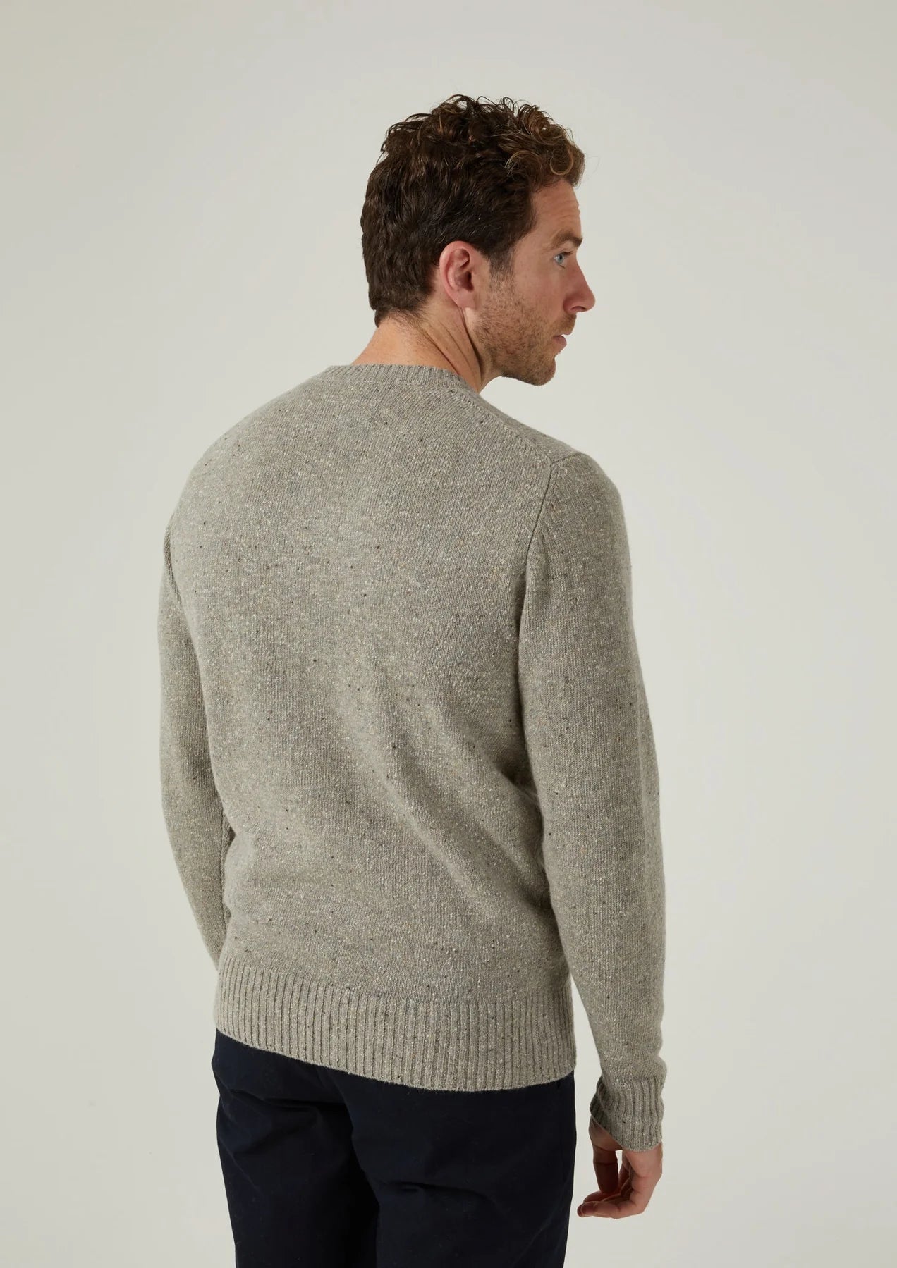 This Soft Donegal crew neck jumper showcases the unique, textured look this handsome yarn offers. The yarn plys are twisted with complementary coloured neps, or flecks, in the traditional spinning process resulting in tweed effect knits with a sumptuous handle.
