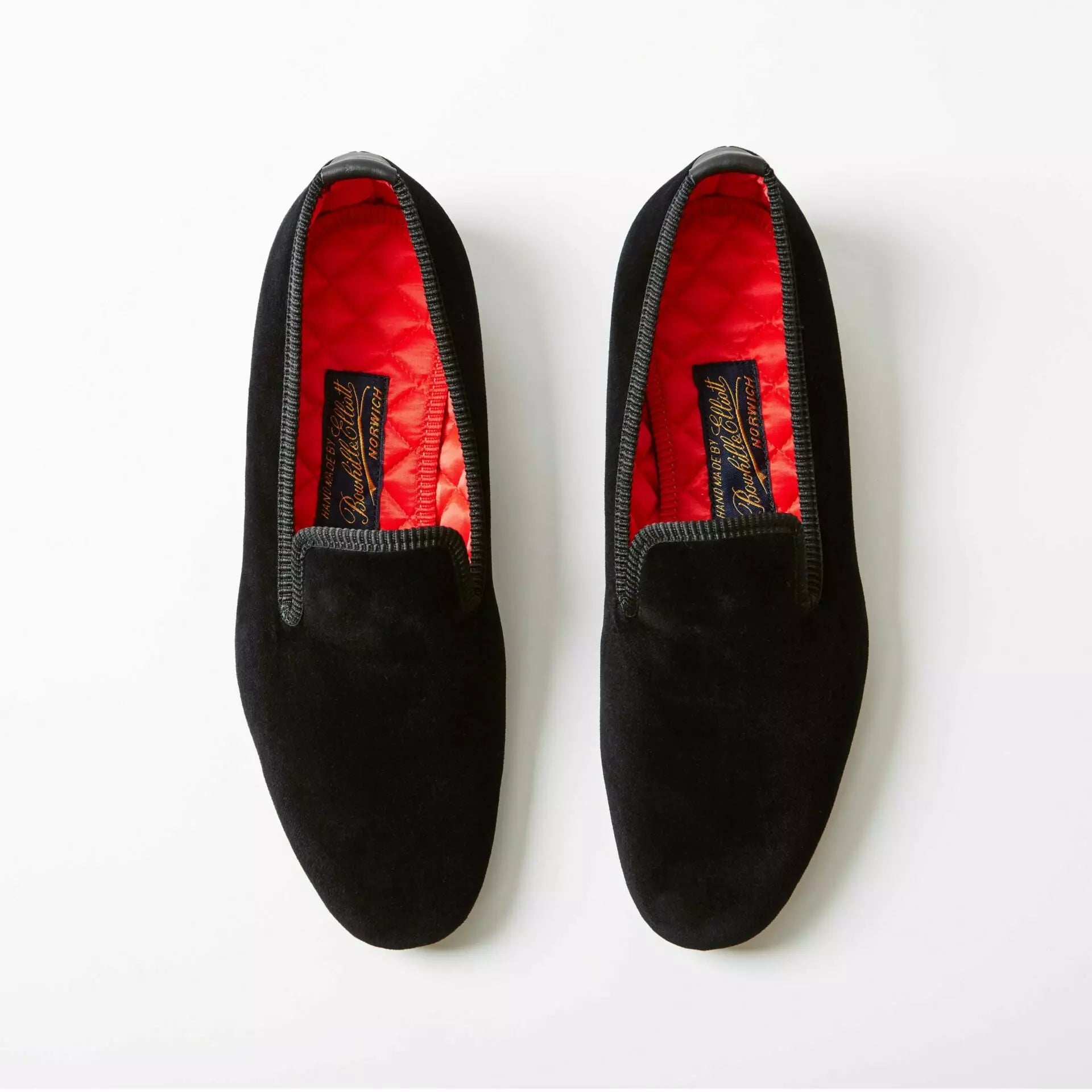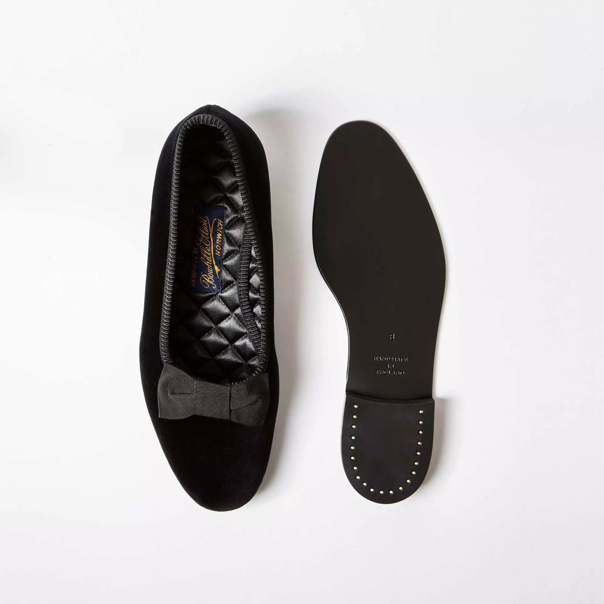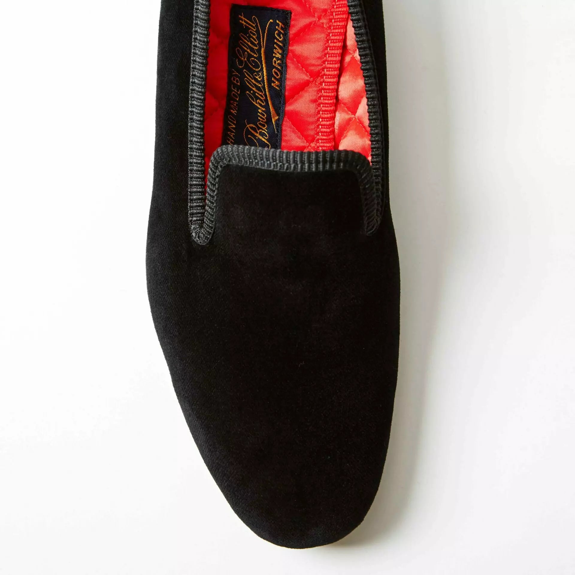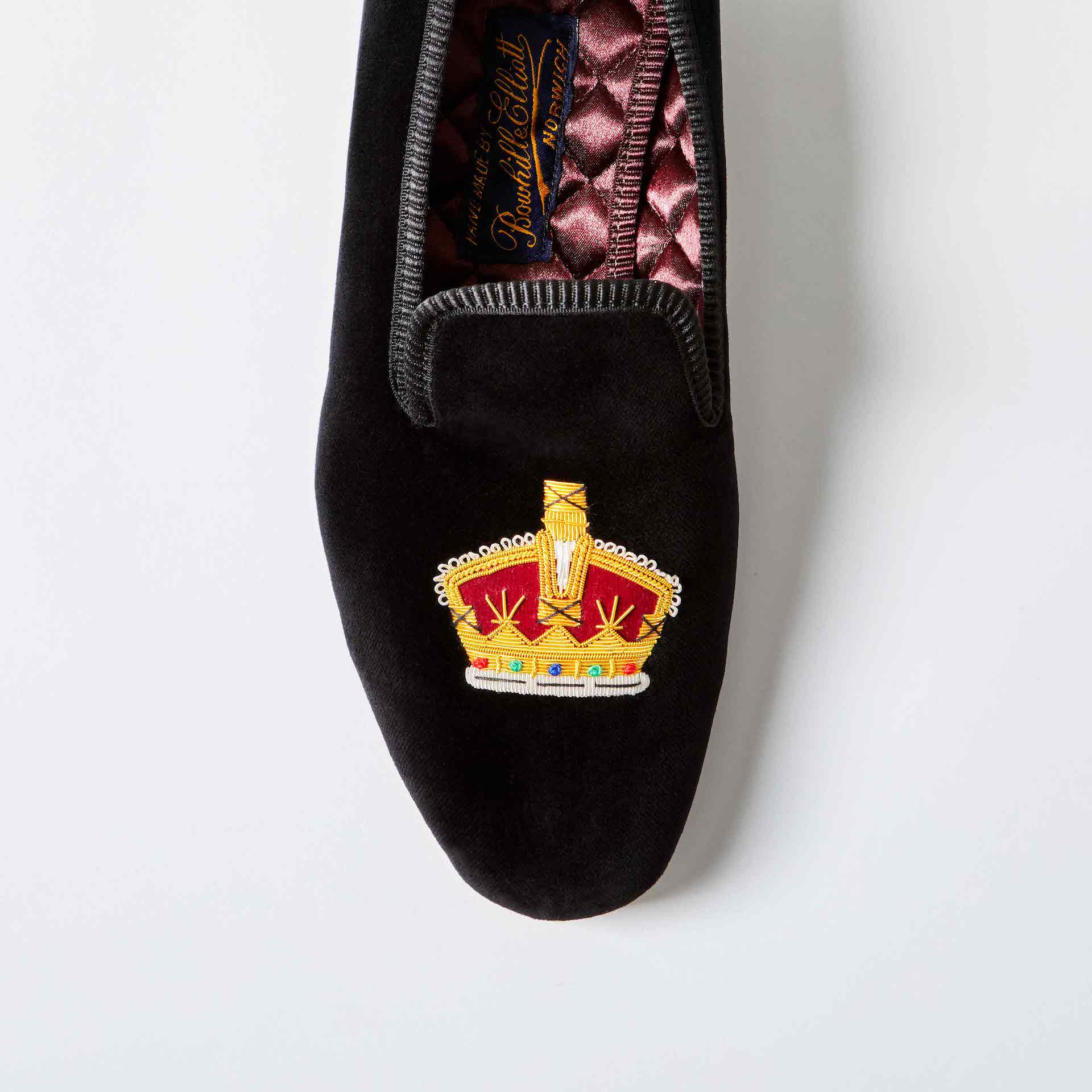 Bowhill & Elliot Black Velvet Albert Slippers with Embroidered Crown