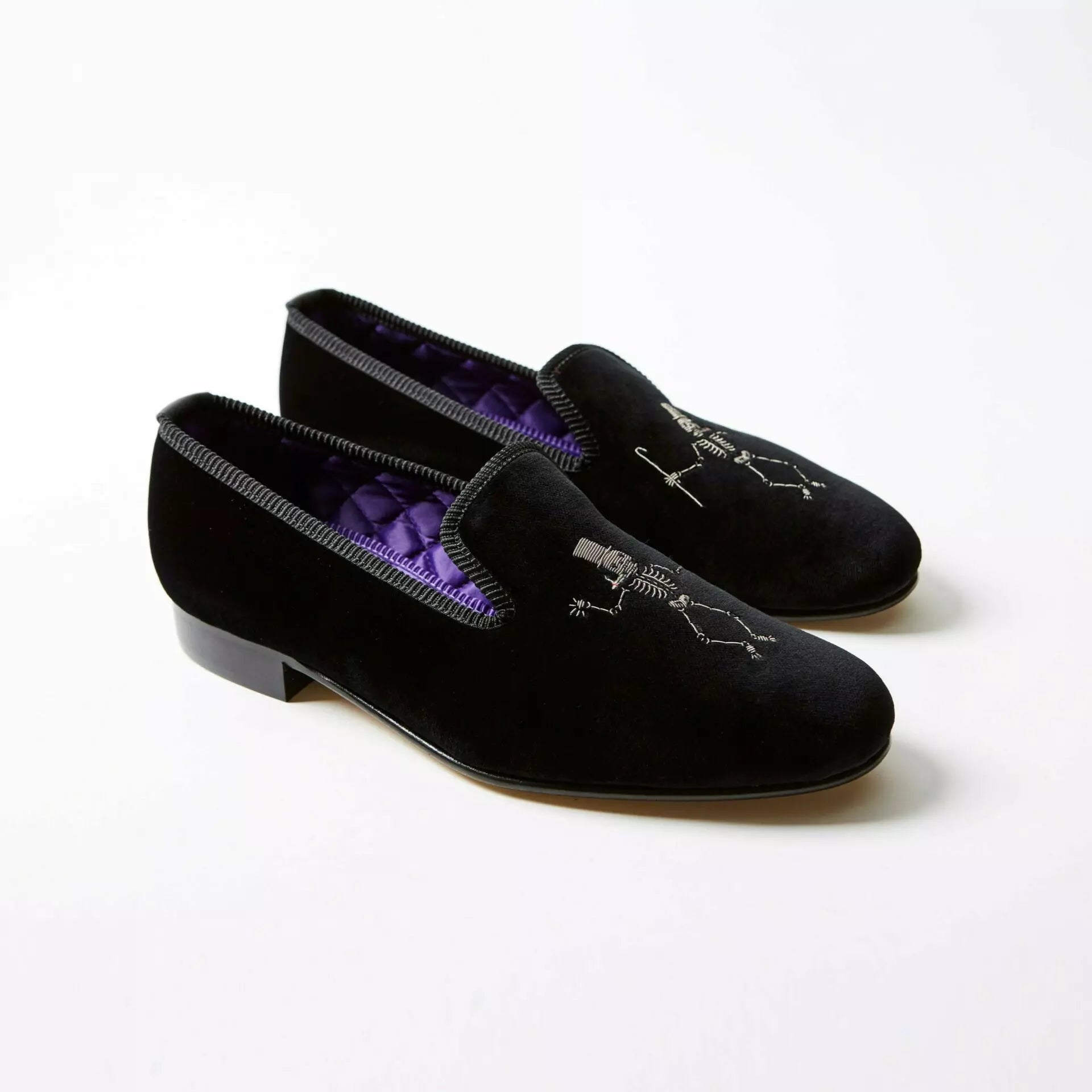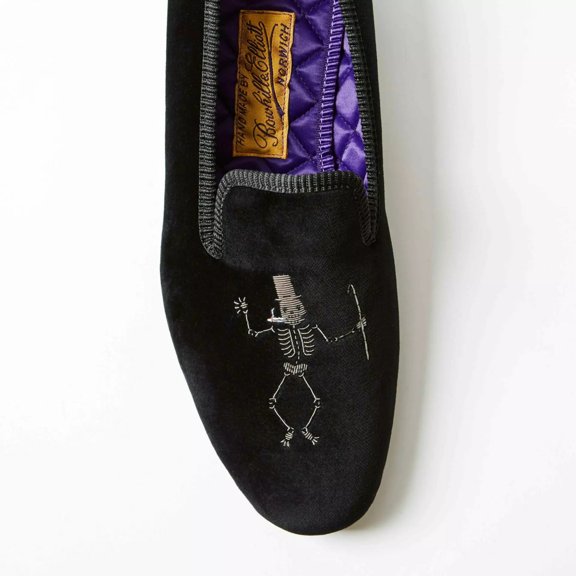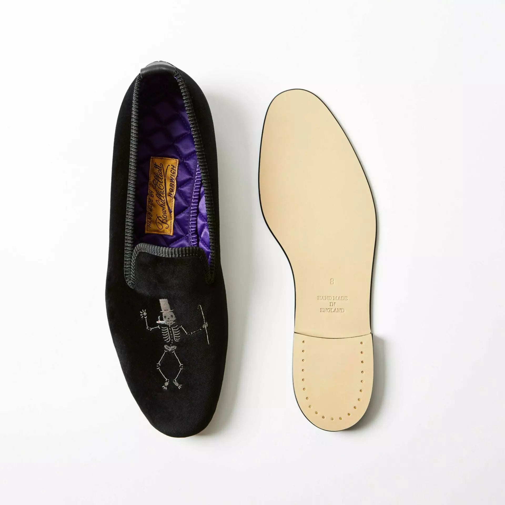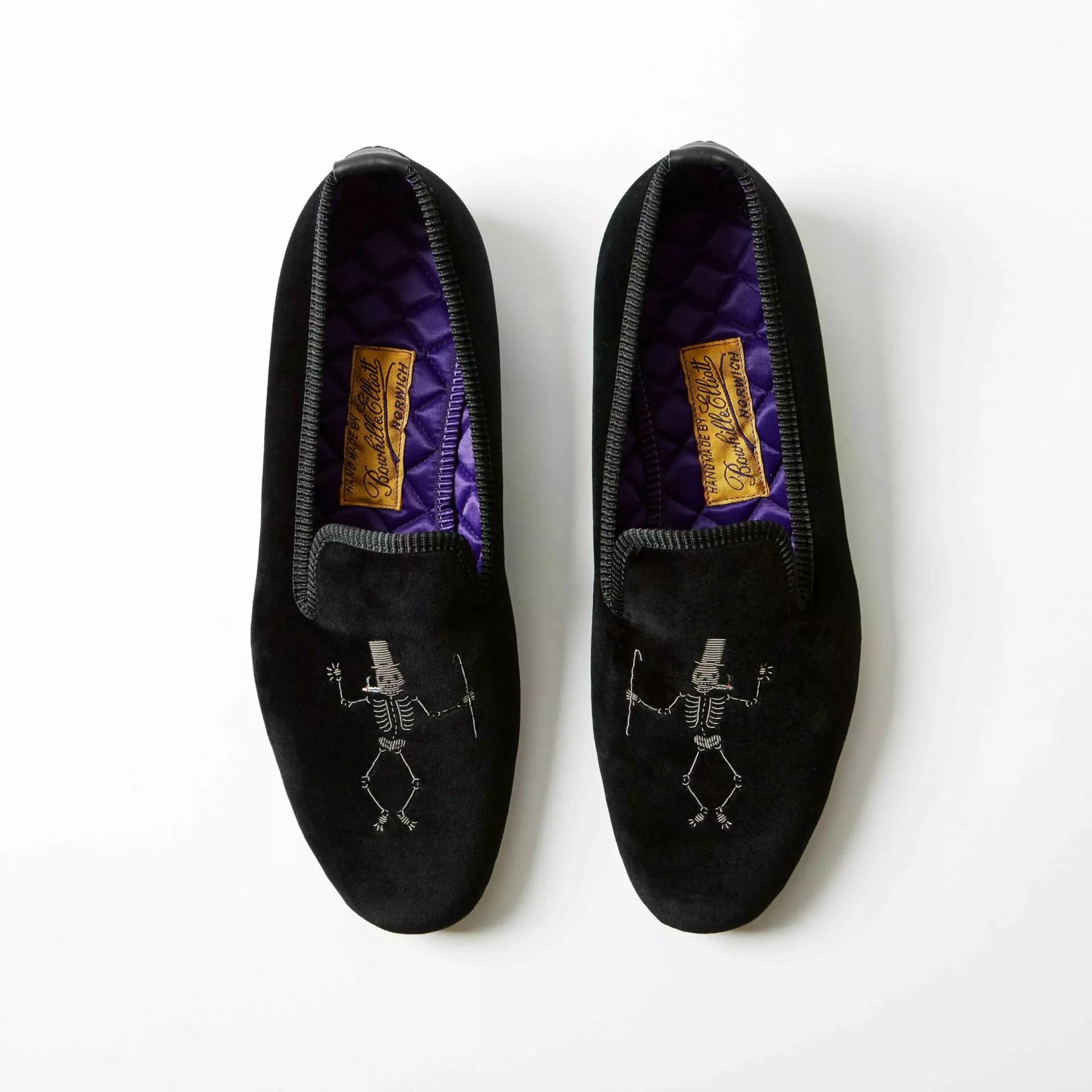 Bowhill & Elliot Black Velvet Albert Slippers with Embroidered Cabaret Skeleton