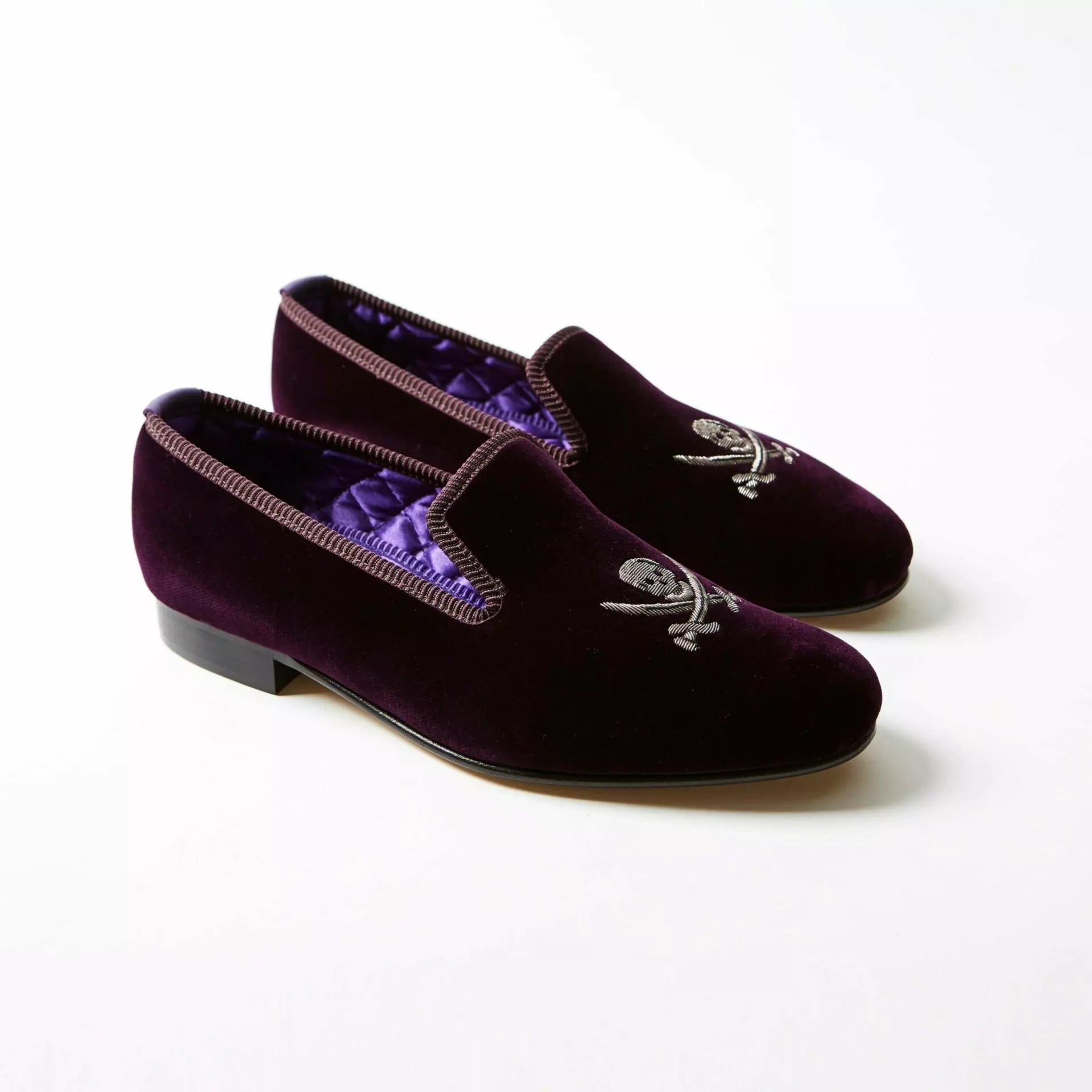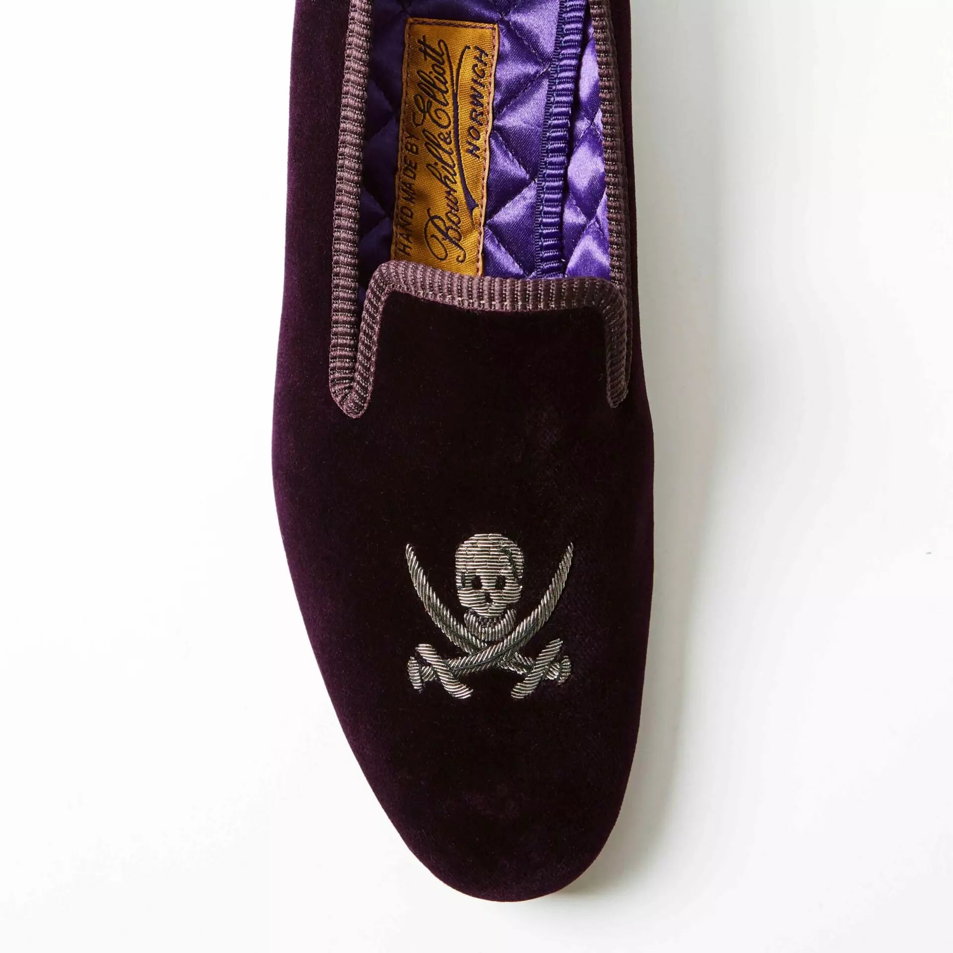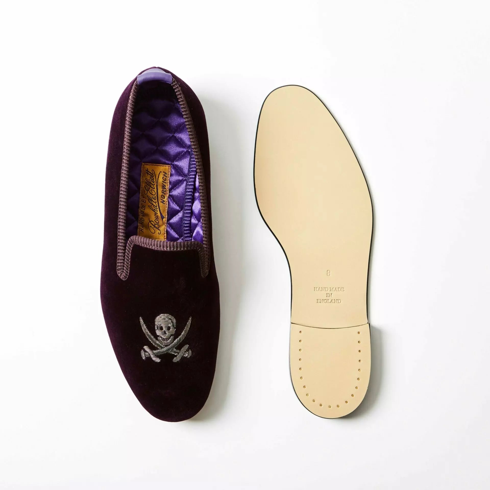 Bowhill & Elliot Regal Velvet Albert Slippers with Embroidered Skull & Sabers