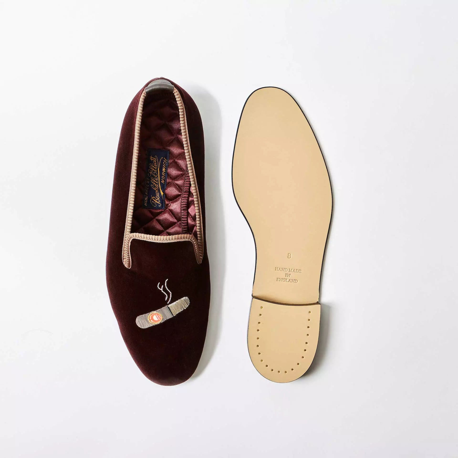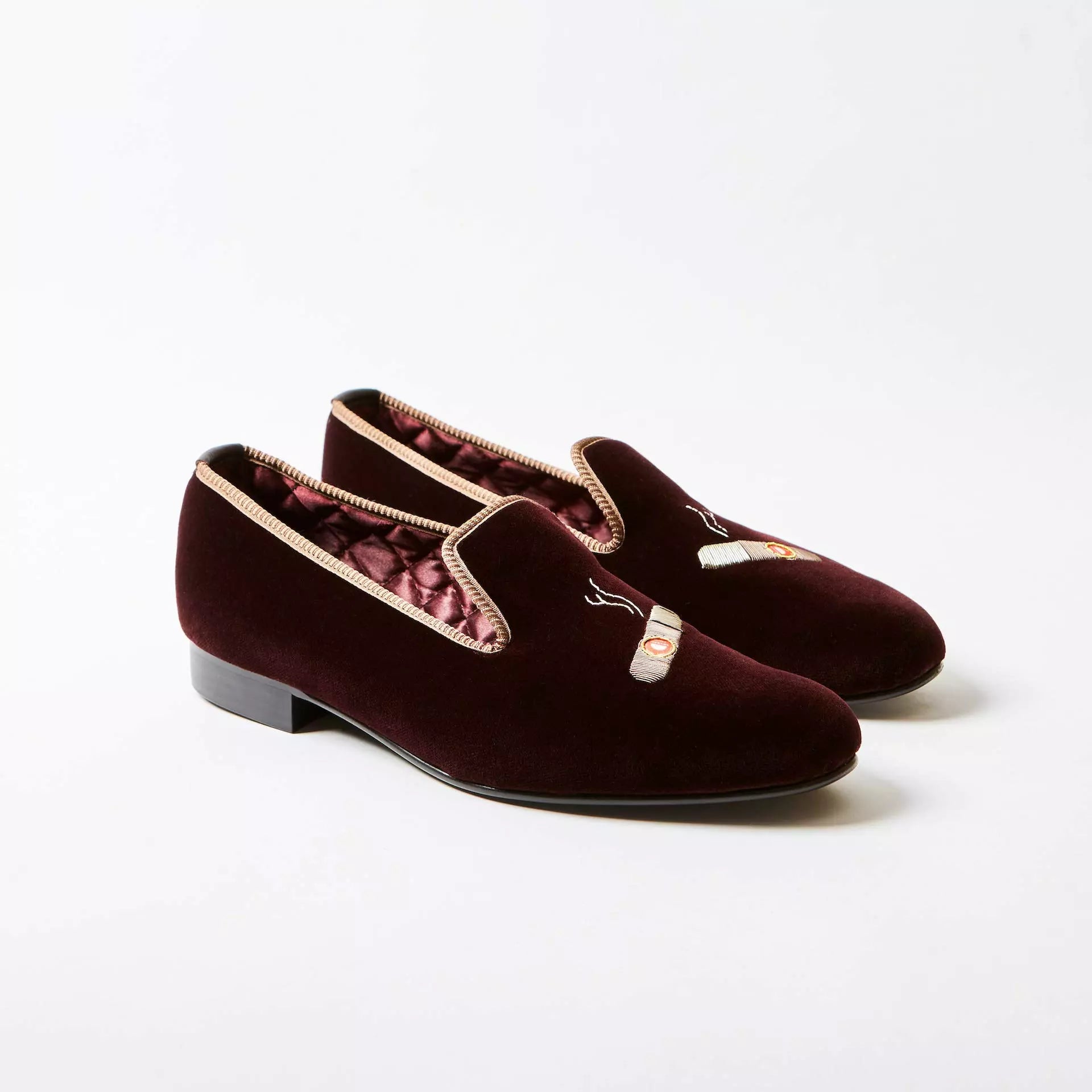Bowhill & Elliot Brown Velvet Albert Slippers with Embroidered Cigar