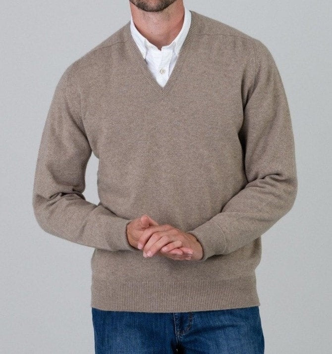 William Lockie V-Neck Natural Tan 2-Ply Cashmere Sweater