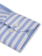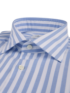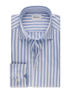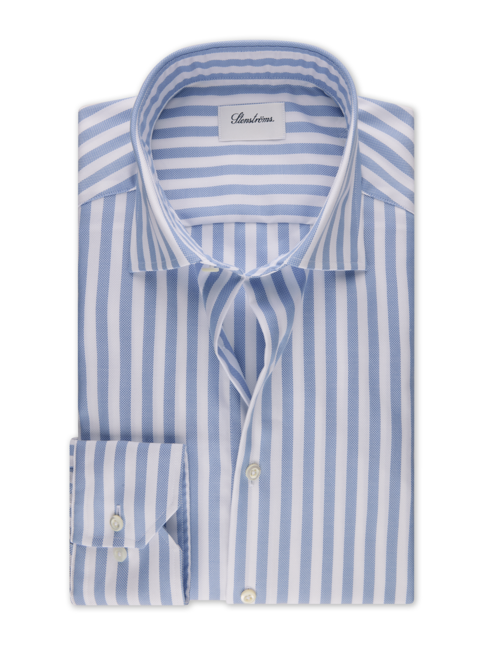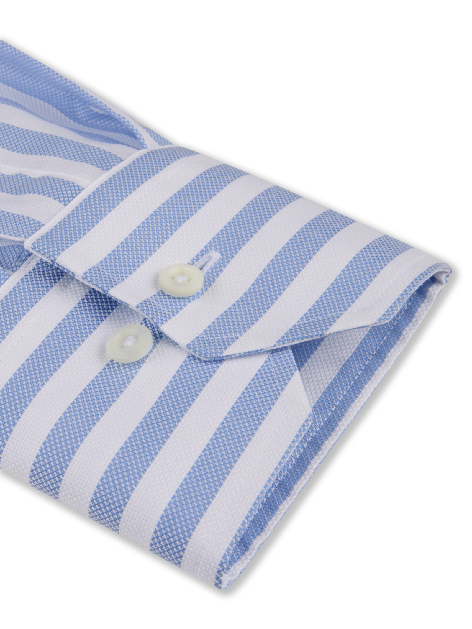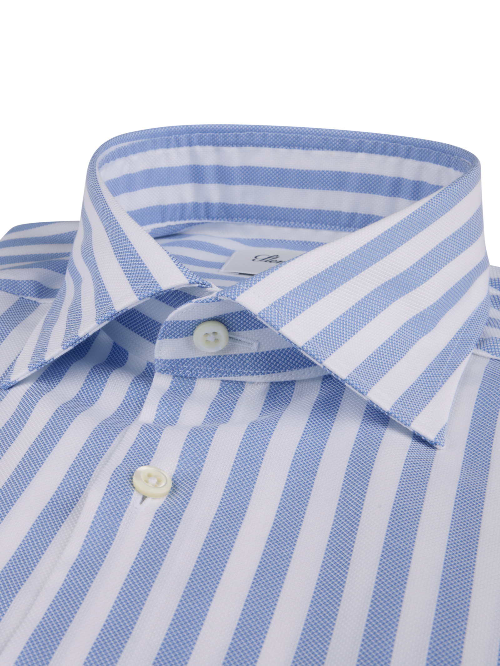 This striped oxford shirt is made of twofold cotton. The shirt is detailed with mother of pearl buttons, single cuffs and a cut away collar.