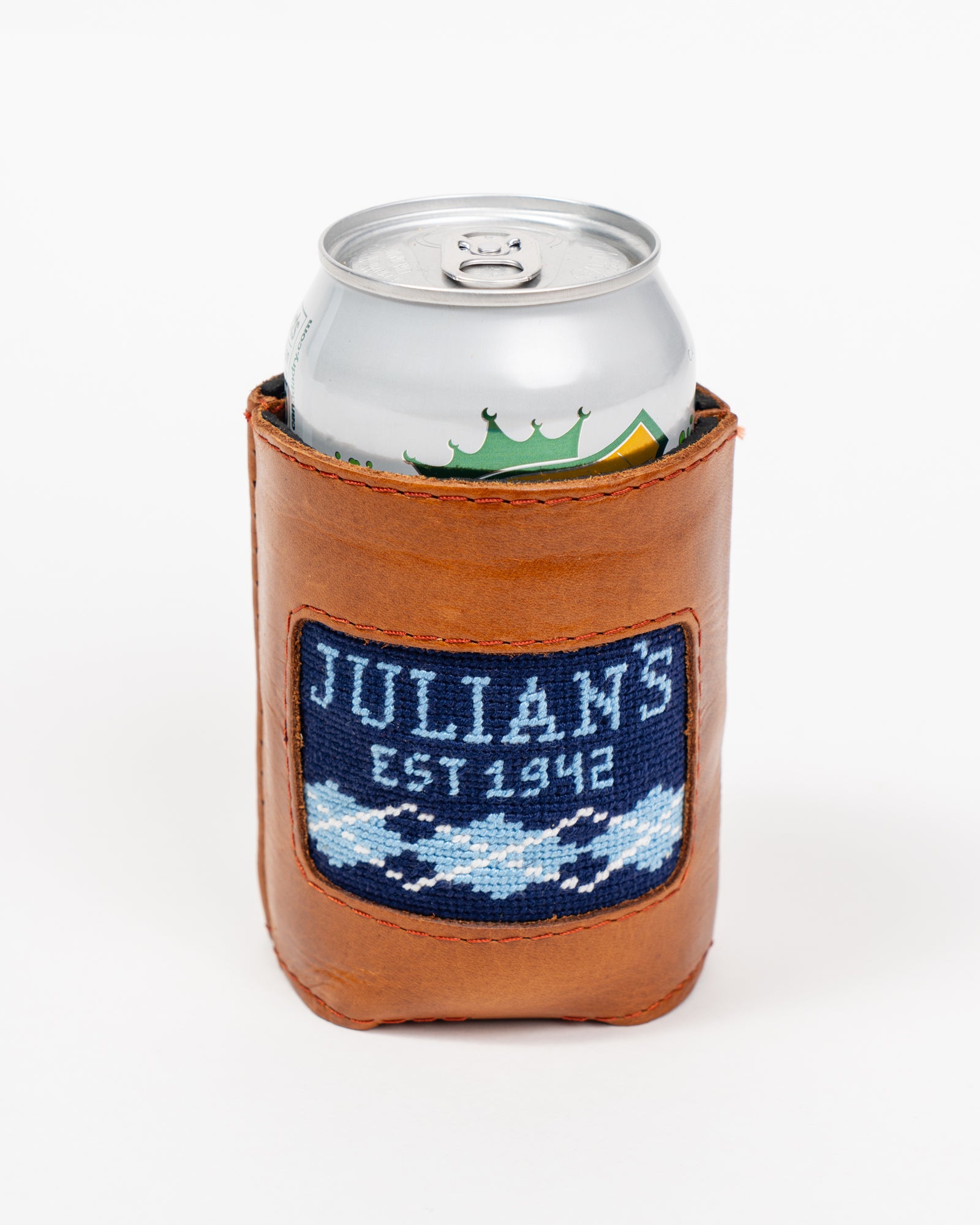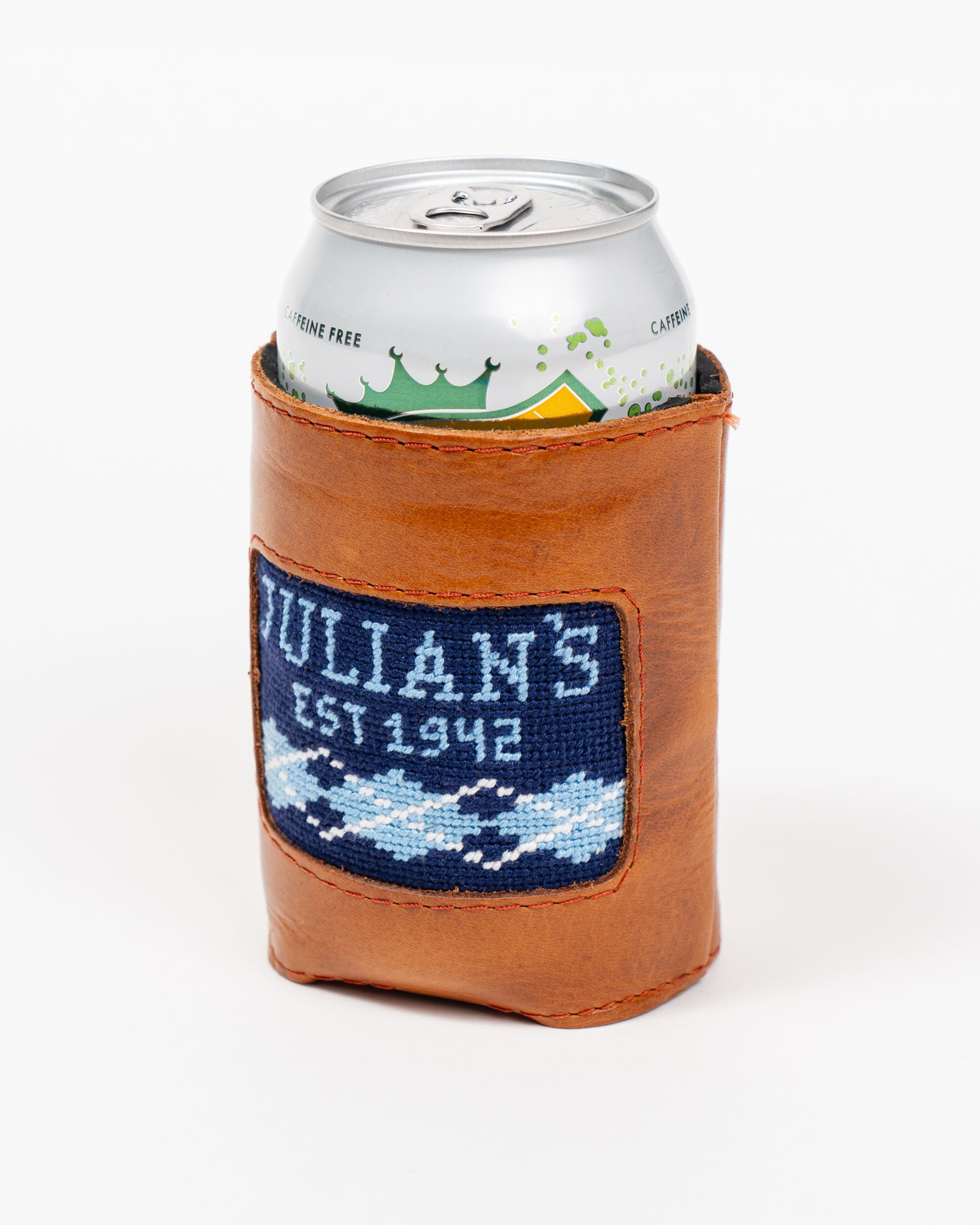 Our can coolers combine our signature 100% hand-stitched needlepoint with an Italian, full grain leather exterior and neoprene liner. Keeping you and your drink cool.
