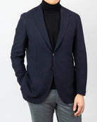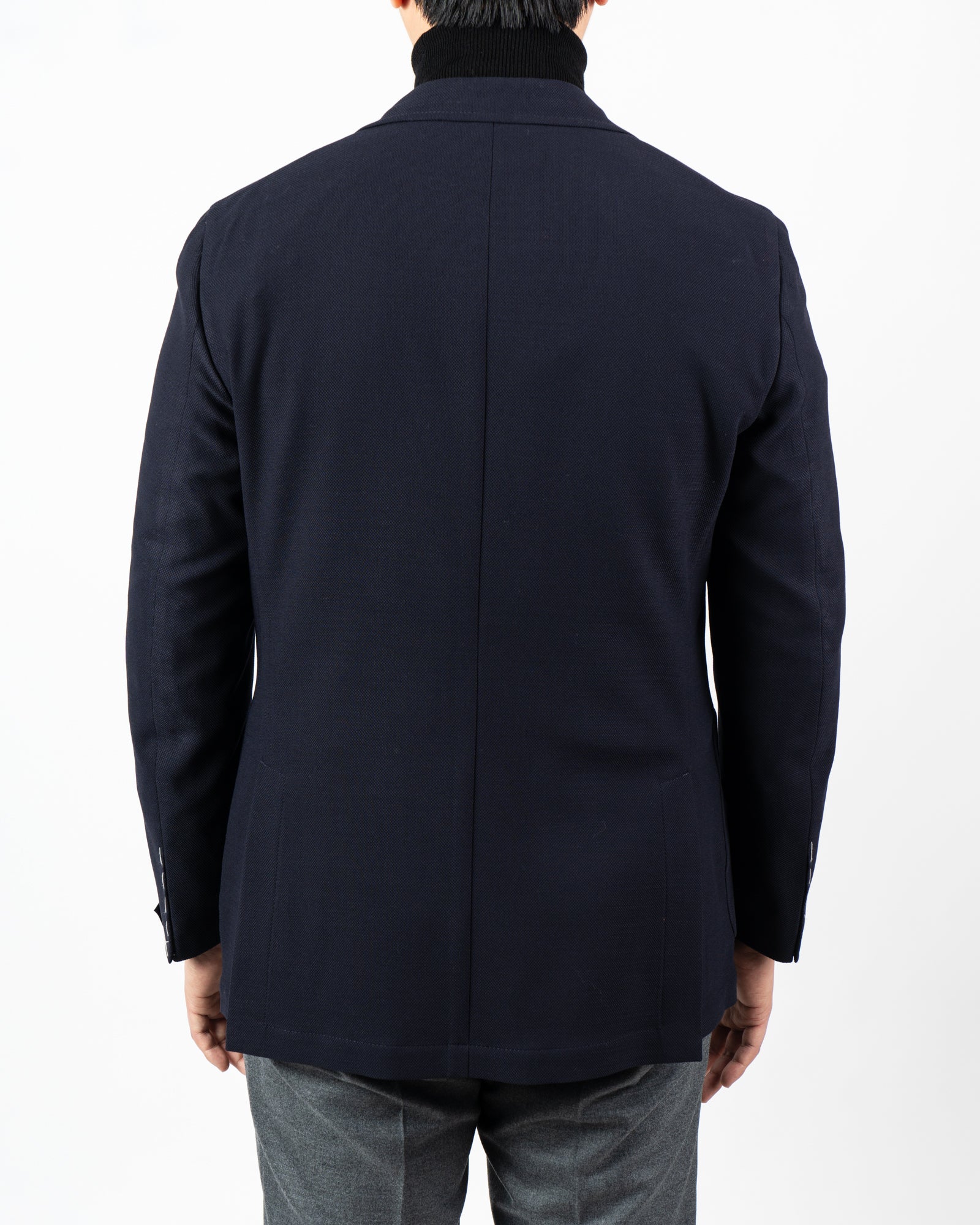Introducing the travel sport coat model. Based off the silhouette of our classic blazer, our travel model completely forgoes canvassing and linings to create a blazer that fits more like a sweater than a jacket. Designed for comfort and wearability, this blazer can easily be packed for travel. Made up in a proprietary wool blend navy blue hopsack from Scabal, great for resisting wrinkles.