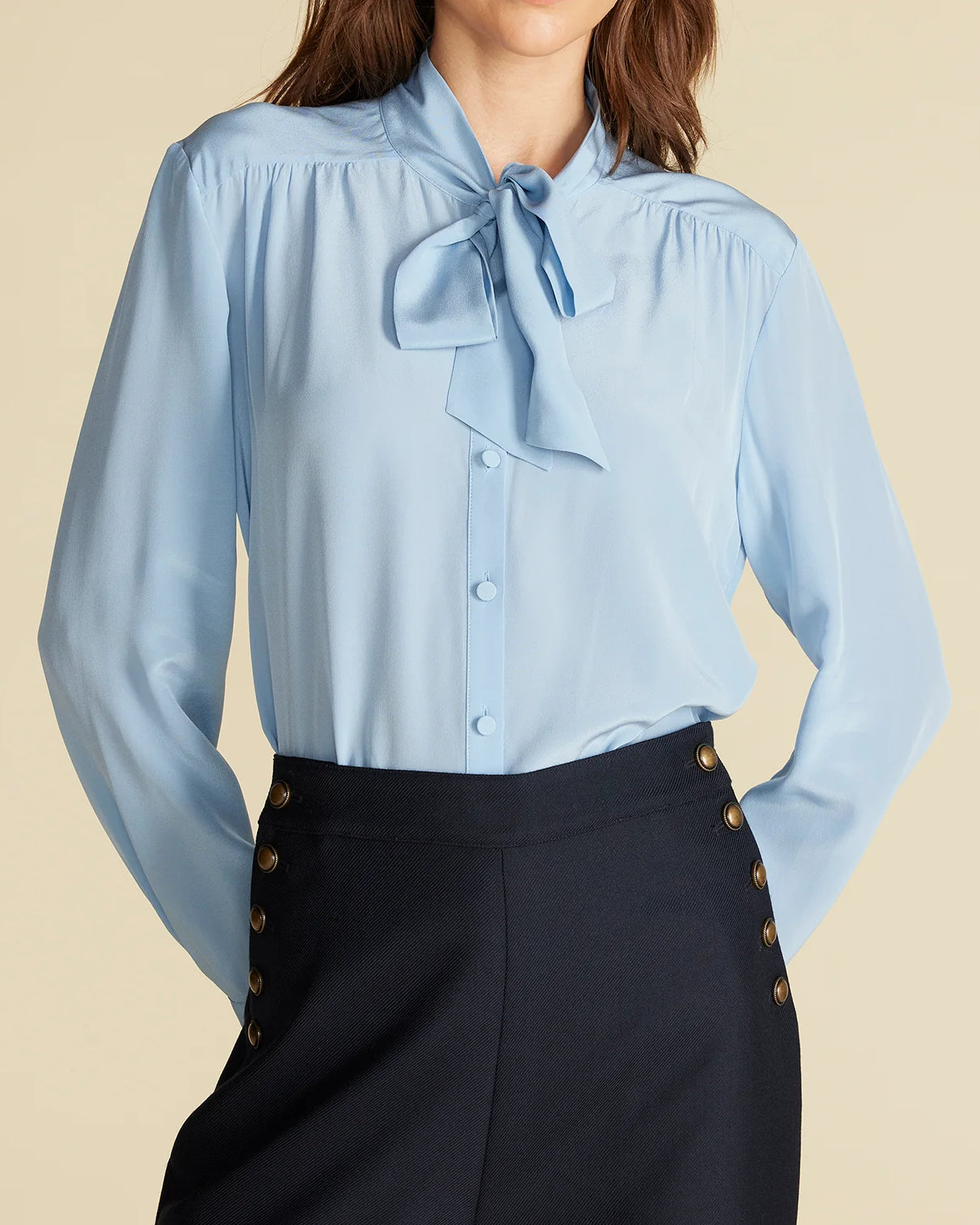 - A button-front blouse with an elongated bow tie at the neck. Features short sleeves with a subtle puff.