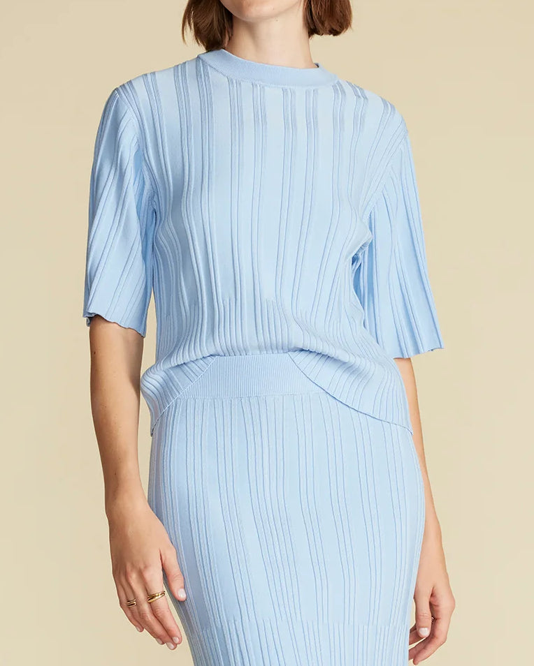 - Crewneck T-shirt with novelty rib stitch detailing. Hits above the hip.